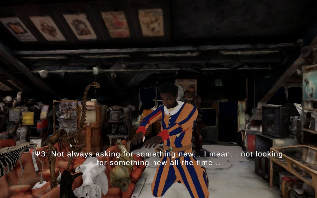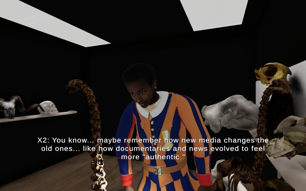 The De Krypten avatar. (Liberate your Avatar from yourself), 2025 by Ilias Marmaras is a multimedia work that combines video and a digital “theatrical” science fiction narrative within three-dimensional spaces. The characters, whose “voices” have been produced using artificial intelligence, are faithful three-dimensional copies of skeletons or skeleton parts of vertebrate animals created by Natural History museums in America. The users of the application have the ability, through an avatar –appearing as a female bodyguard of the Swiss Guard of the Vatican – which has the role of animator of the skeletons, to move within the three-dimensional spaces and watch the dialogues between the simulated bones (the actors/performers) and the accompanying sounds of the “performance.”