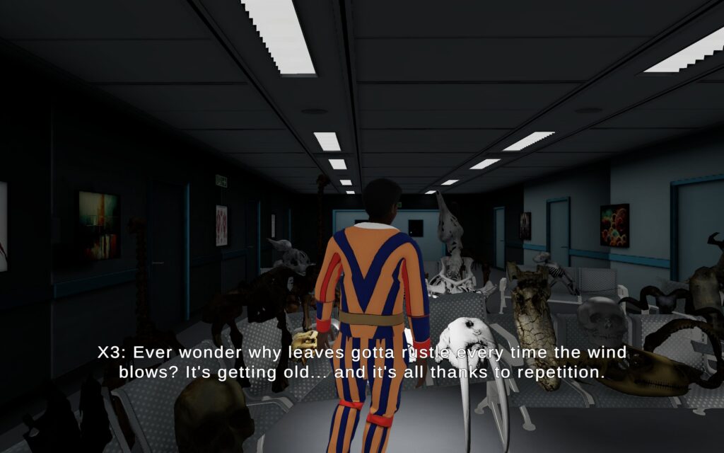 The fragmented yet interconnected dialogues of the skeletons, which relate to each space, raise different timeless issues, such as the nature of time, identity and existence. The characters/skeletons of vertebrate animals – which on the one hand are connected to reality and constitute part of our past, and on the other hand have the property of speaking and discussing in virtual spaces – are named X1, X2, X3, Ψ1, Ψ2, etc., reminding us of the unknown variables in the Cartesian coordinate system or interdependent equations. The choice of these names emphasizes how everything around us is interconnected and raises the question of what it means to be a constantly evolving entity in a world full of changes. In this way, Marmaras focuses on the ideas and issues he wants to touch upon rather than on plot and characters, as in James Joyce’s book Ulysses (1920), particularly in Molly Bloom’s final monologue, where a continuous fragmented flow of thoughts and memories is observed, so as to express the fluid nature of the perception of time and life in general. Also, the dialogues of the skeletons could be understood as the voices inside a person’s head, who has no center and whose ideas are constantly changing, as happens with Ulrich, the protagonist of the novel The Man Without Qualities (1st volume 1930, 2nd volume 1933 and 3rd volume 1943) by the Austrian writer Robert Musil, as well as in the characters of Samuel Beckett’s latter theatrical works who deliver fragments of dialogues, which can be interpreted as voices coming from the unconscious.