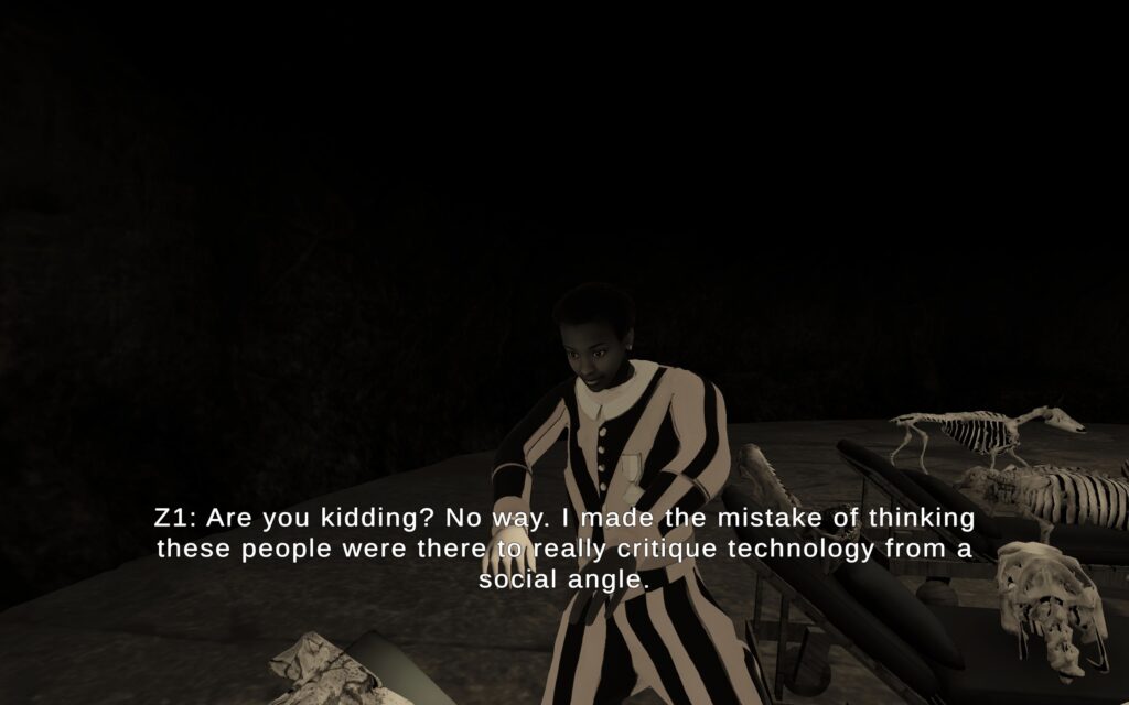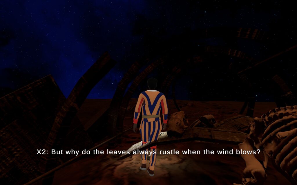 The work’s characters do not wish to be objects, bodies. They do not want to have material substance. They desire to be transformed into flow and affect, like their fluid speech and fragmented dialogues. Only their bones testify to their materiality. They are interested in de-materialization. The viewers who have the ability to download the application on their mobile phones and dedicate as much time as they want, at any moment, to navigate the different spaces, to repeat and focus on the scenes of their interest, essentially they also escape from reality and the physical world and become part of virtual reality, as they, themselves, acquire a new existence on the internet.